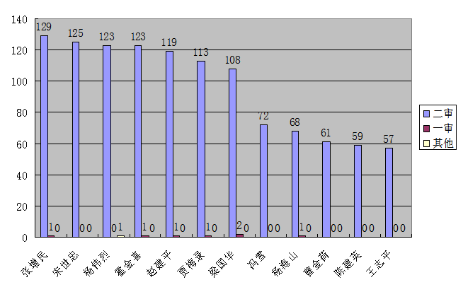 可以看出担任二审程序审判长100件以上的法官有7名,100件以下法官为5名。